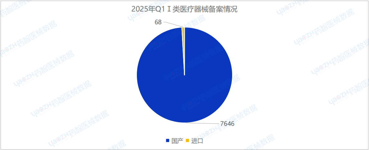 2025年Q1季度中,国产Ⅰ类医疗器械备案批准数量共7646项,环比减少27.6%。同时,进口Ⅰ类医疗器械备案批准数量共68项,环比减少35.2%。